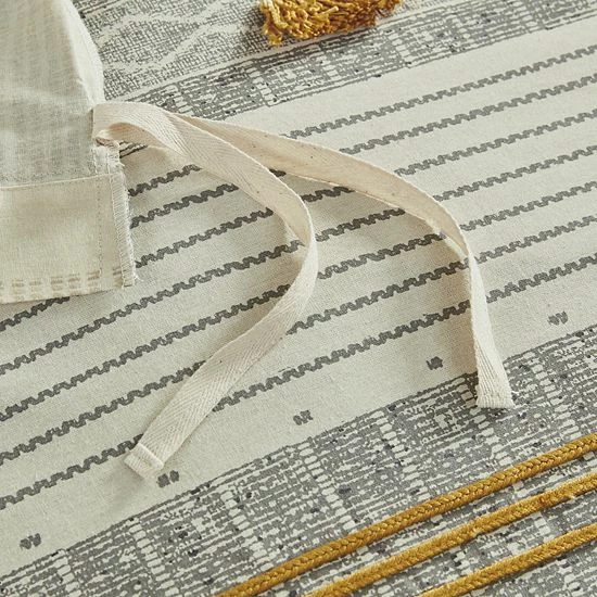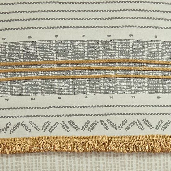 - Gray and yellow striped print with pompom and trim details for a casual, yet sophisticated look