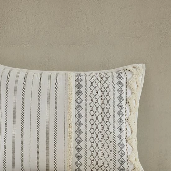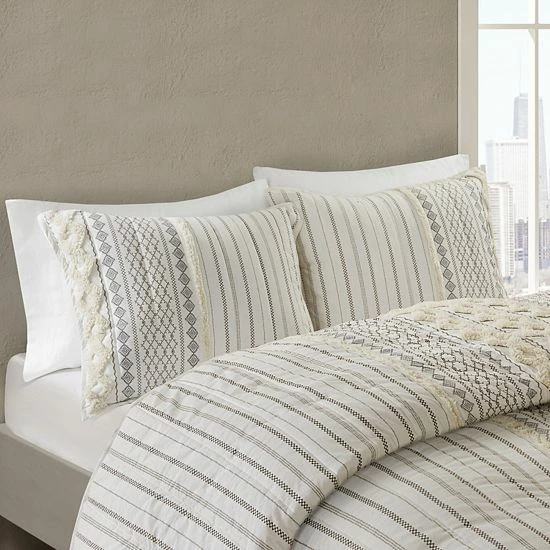 - Geometric prints with tufted Cotton chenille strip trims for a sophisticated look
