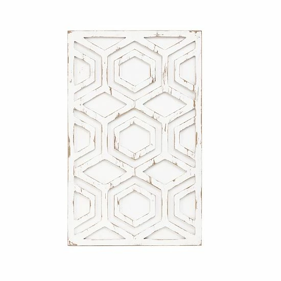 - Hexagonal design in distressed beige wood finish, creating a rustic look